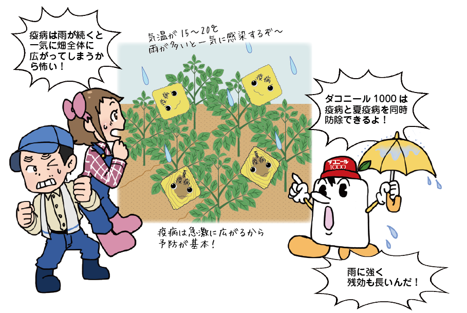 茎葉を枯らし、収穫いもを腐敗させるため、大きな減収につながります。