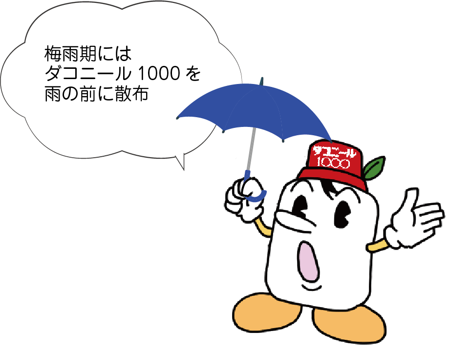 定植2~3週間後から同時防除を開始しましょう。天候に注意して、雨の前にダコニール1000を散布してください。
