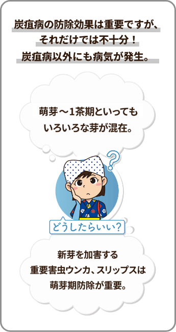 また、三番茶や秋芽、更新園は芽のバラつきが大きく、防除適期の判断が難しいです。