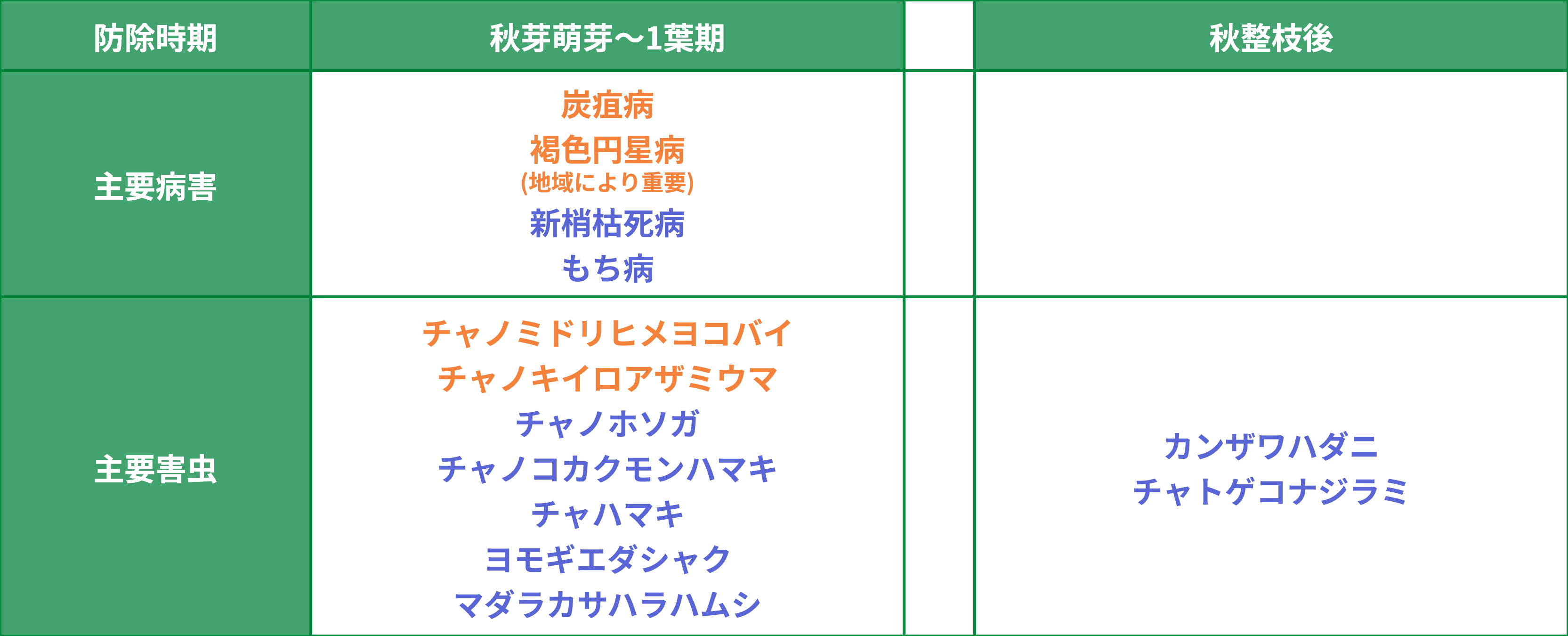 - 秋芽充実に影響の大きな炭疽病、褐色円星病、もち病、チャノミドリヒメヨコバイ、チャノキイロアザミウマを重点に防除する。