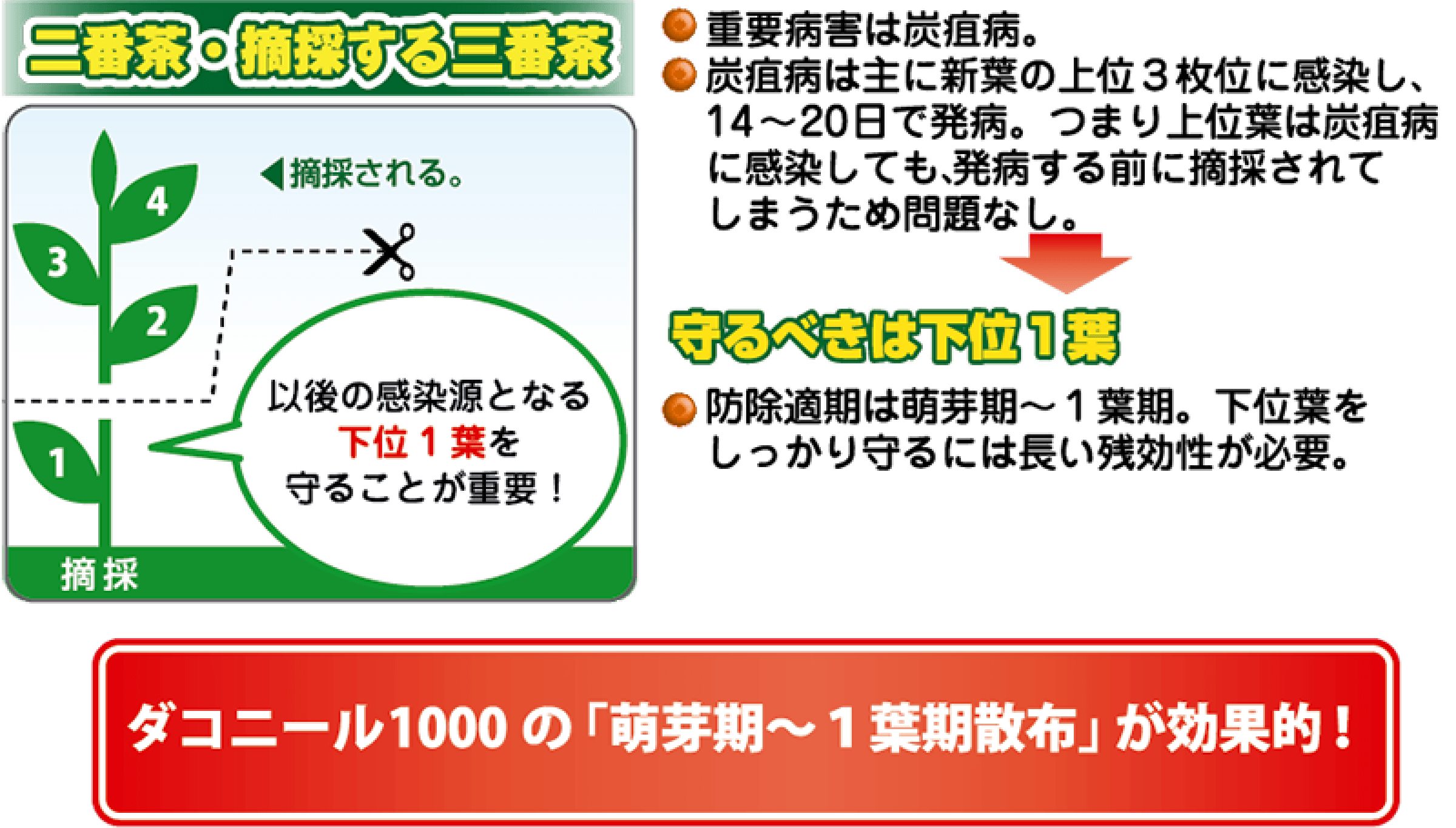 - 萌芽~1葉期防除は極めて重要。予防効果・残効性に優れるダコニール1000で省略せず実施。