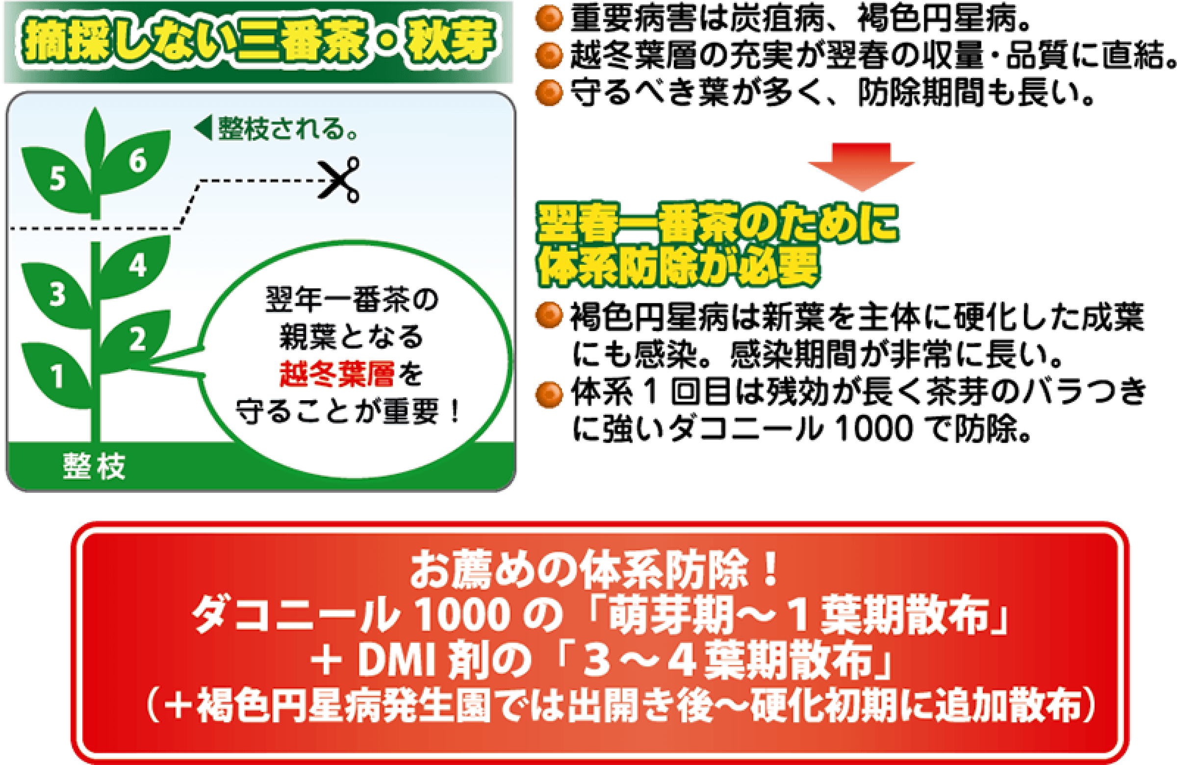 越冬葉層を形成する秋期の防除が重要です。萌芽~1葉期と3~4葉期の2回散布で炭疽病と同時防除しましょう。