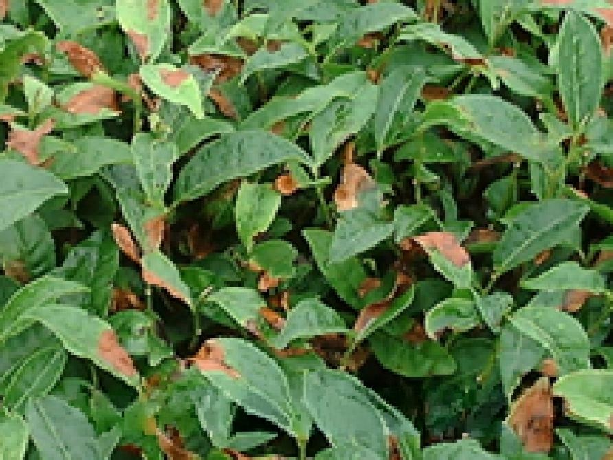 炭疽病は茶の最重要病害。新芽生育期に降雨が続くと多発します。