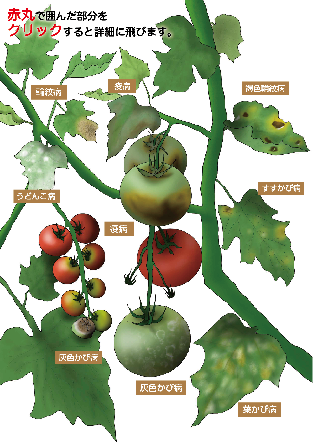 | トマト | 葉かび病、すすかび病、 うどんこ病、灰色かび病、疫病 輪紋病、炭疽病、褐色輪紋病 斑点病 |