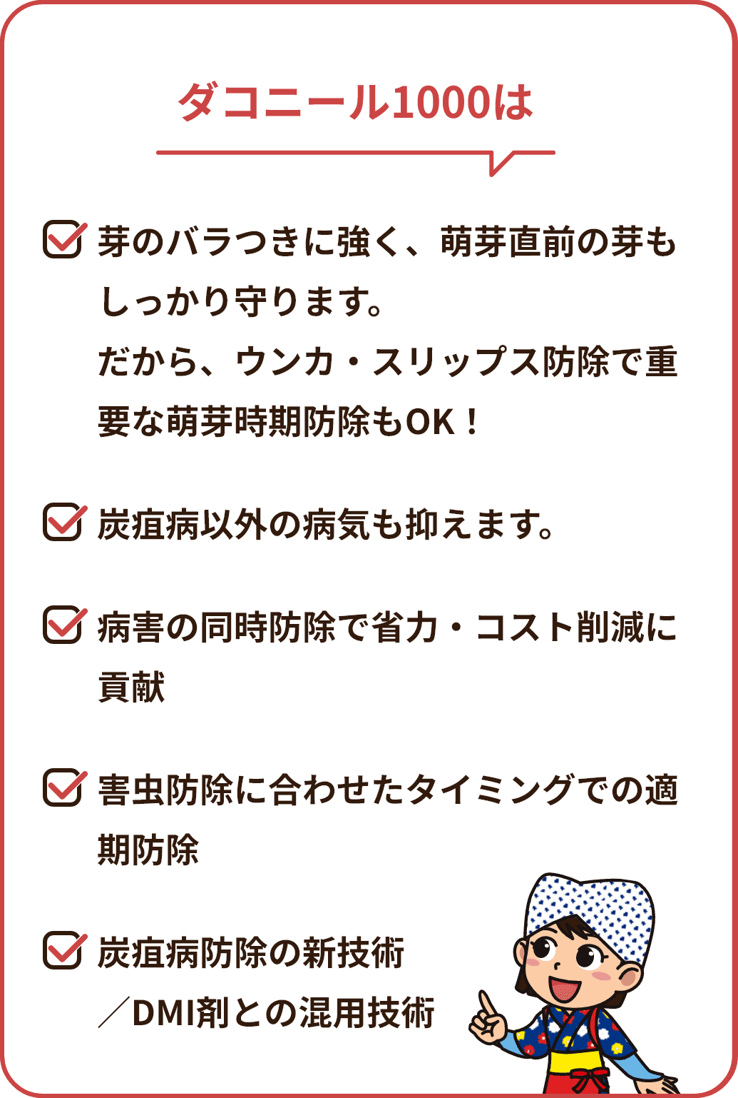 炭疽病、褐色円星病など多くの病害を抑えるダコニール1000を活用すれば、大幅な省力・コスト削減が期待できます。