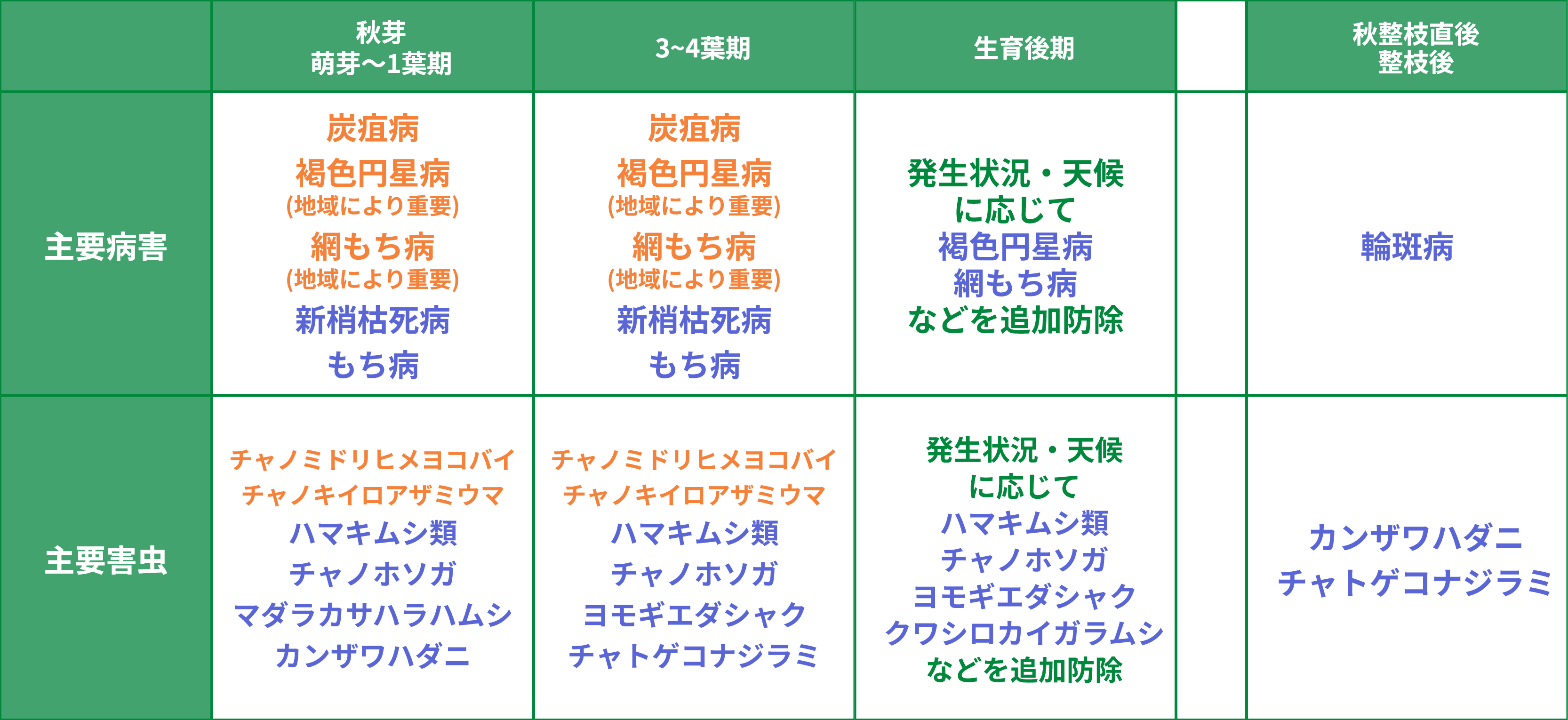 長い秋芽生育期間中の被害を防ぐため、生育初期・中期に体系防除(基幹)、後期等に補完・臨機防除で、総合的に病害虫を防除する。