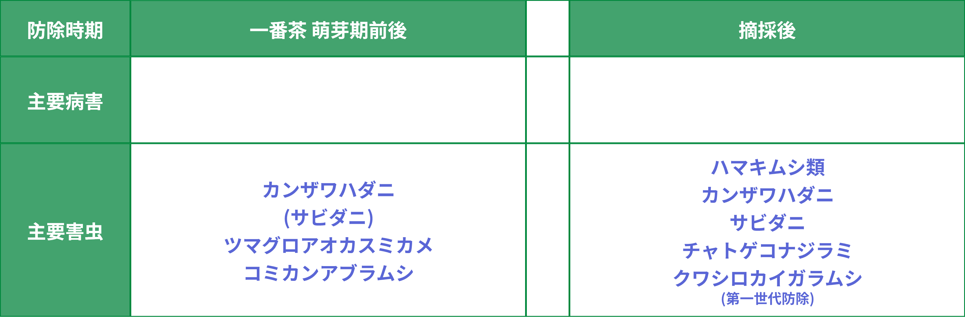 - 地域・気象条件などにより茶の生育及び病害虫の発生状況は異なります。